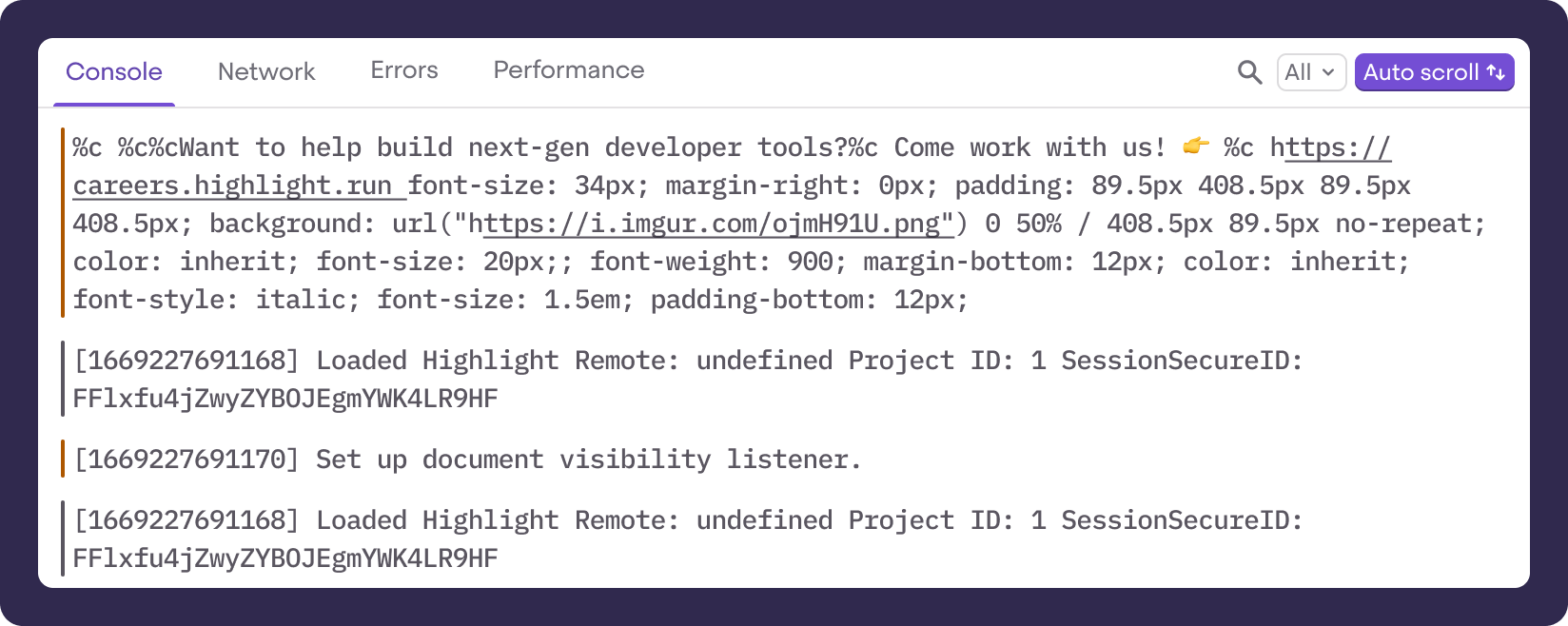 highlight.io supports recording all of the resources that you see in the chrome dev-tools window; that is, console messages, network requests and errors. Read more about how to instrument this data in our sdk configuration docs. Here's a sneak peak of what this looks like: